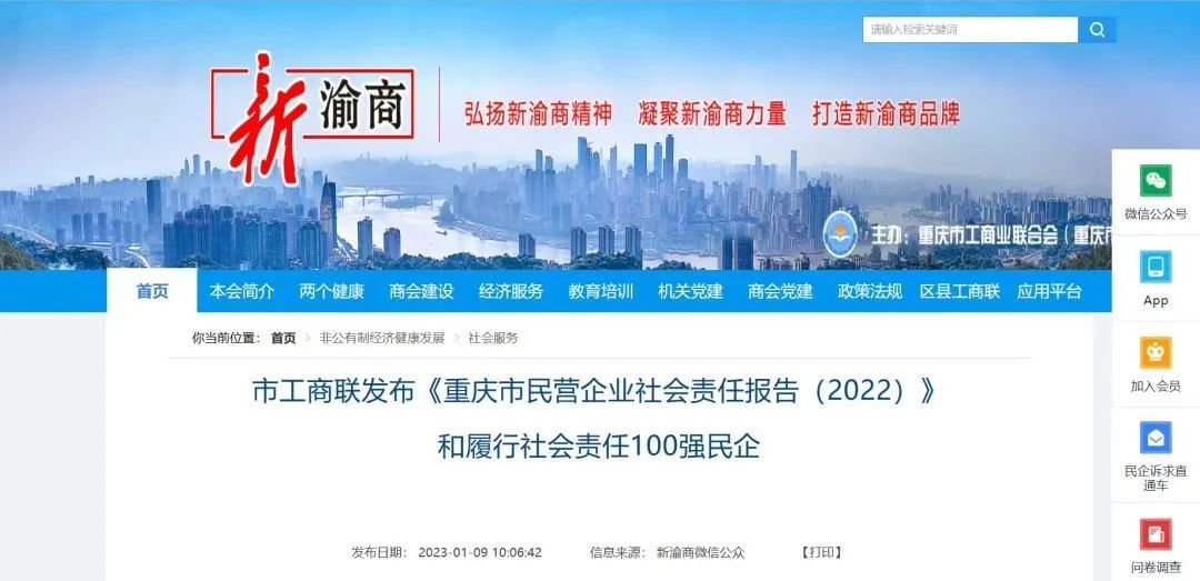 1月6日,重慶市工商聯(lián)發(fā)布《重慶市民營企業(yè)履行社會(huì)責(zé)任報(bào)告(2022)》,并揭曉2022重慶市民營企業(yè)社會(huì)責(zé)任100強(qiáng)榜單。榜單中,江津區(qū)6家有民營企業(yè)上榜,新西亞鋁業(yè)集團(tuán)位列其中。