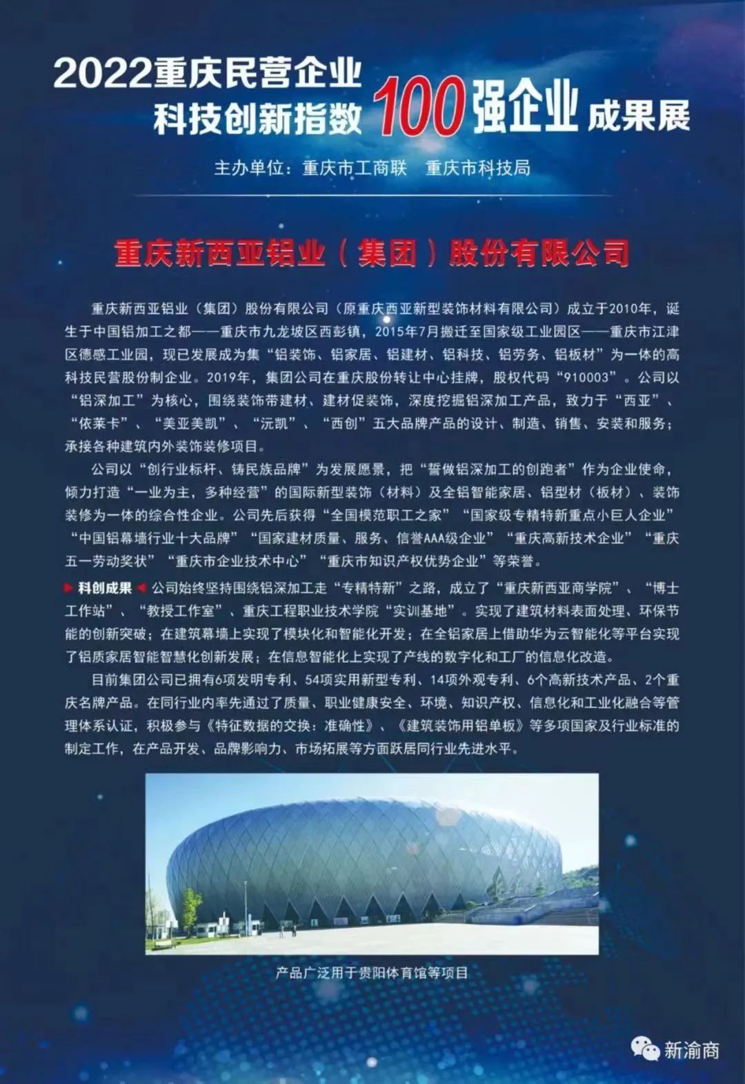 1月9日,重慶市工商聯(lián)(總商會)六屆一次常委會議、六屆二次執(zhí)委會議召開。會議發(fā)布了2022重慶民營企業(yè)科技創(chuàng)新指數(shù)百強企業(yè)榜單。新西亞鋁業(yè)集團上榜“2022重慶民營企業(yè)科技創(chuàng)新指數(shù)百強企業(yè)”。