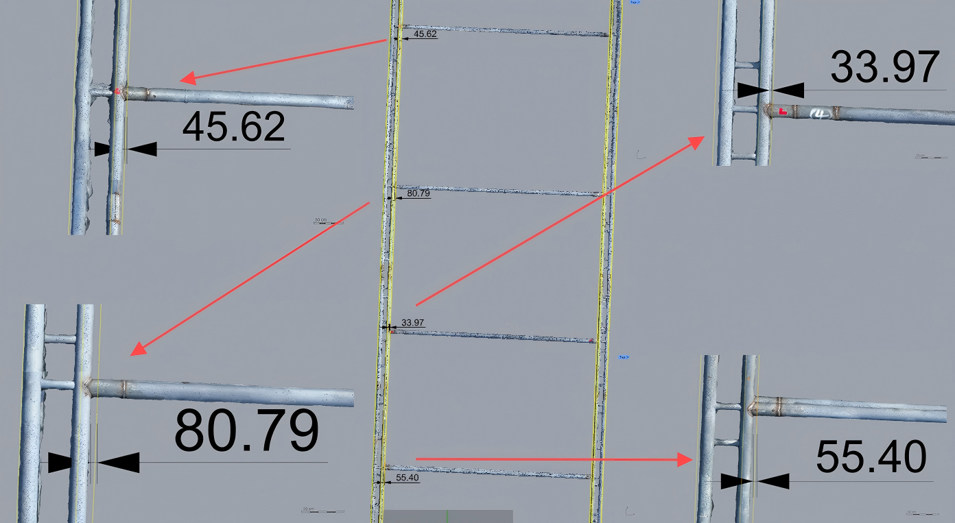 2024年末,我司鋁科技事業(yè)部將這一技術(shù)正式運(yùn)用到實(shí)際項目中,并結(jié)合激光全站儀測量數(shù)據(jù)比對驗證精度,最終實(shí)現(xiàn)了較高精度地還原現(xiàn)場主體結(jié)構(gòu)信息,并為后續(xù)現(xiàn)場施工與材料組織提供了極大的助力。