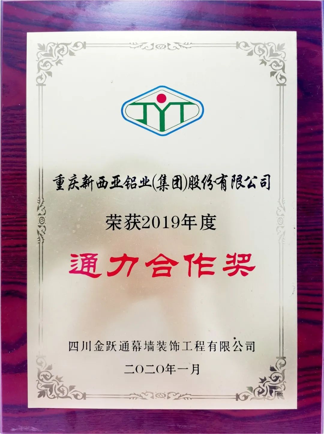 榮獲四川金躍通幕墻裝飾工程有限公司2019年度“通力合作獎”
