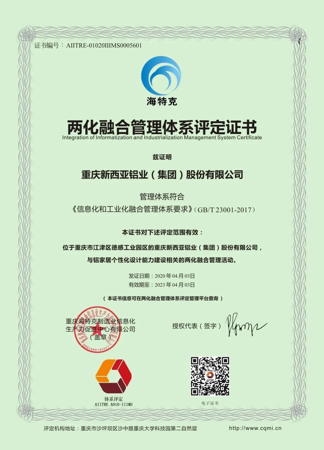 2020年榮獲兩化融合管理體系貫標認證