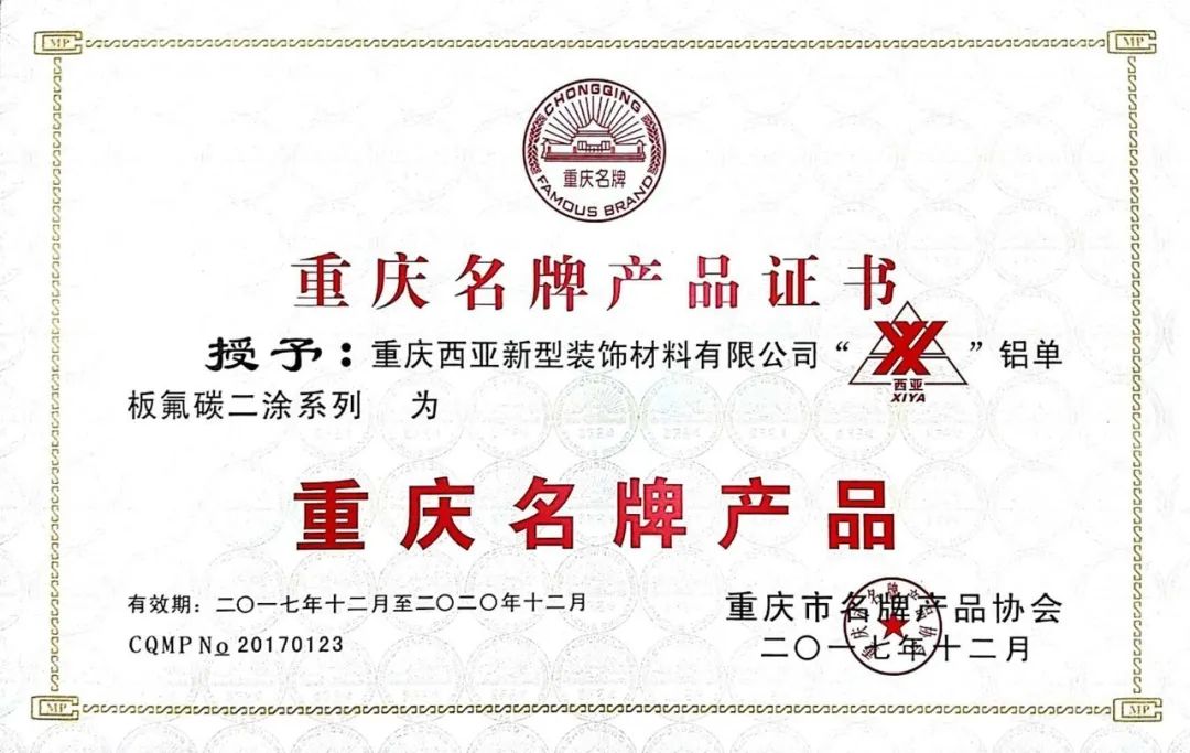 公司鋁單板粉末噴涂系列、氟碳二涂系列產品被授予重慶名牌產品
