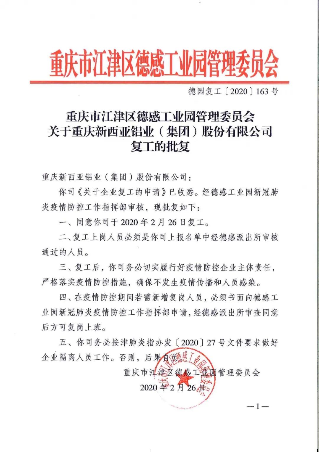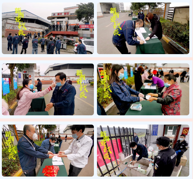 根據(jù)重慶市江津區(qū)《工業(yè)企業(yè)開工復(fù)工辦法》有關(guān)規(guī)定,結(jié)合公司生產(chǎn)經(jīng)營實(shí)際,本著“兩手抓兩不誤”的原則,重慶新西亞鋁業(yè)(集團(tuán))股份有限公司于2020年2月26日獲批正式復(fù)工,為了積極應(yīng)對疫情防控與生產(chǎn)恢復(fù),公司正全力推動各項(xiàng)工作。