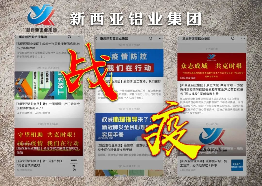 疫情就是命令,防控就是責(zé)任。自疫情發(fā)生以來,重慶新西亞鋁業(yè)集團(tuán)第一時間成立了疫情防控工作領(lǐng)導(dǎo)小組,研究、部署、動員、落實(shí)新冠肺炎疫情防控工作,要求把公司全體員工的身體健康和生命安全放在第一位。防控工作領(lǐng)導(dǎo)小組組長由公司黨支部書記、總經(jīng)理劉斌擔(dān)任。疫情復(fù)工前夕,為了讓全體員工有危機(jī)意識、自我保護(hù)意識和利他意識,公司疫情防控小組利用微信群、QQ群、微信公眾號等方式積極開展、落實(shí)關(guān)于疫情防控工作的有關(guān)精神和要求并詳細(xì)制定相關(guān)措施,引導(dǎo)全體員工通過“平安江津”查詢生活軌跡,為堅(jiān)決打贏疫情防控和復(fù)工復(fù)產(chǎn)作精心施策和準(zhǔn)備。