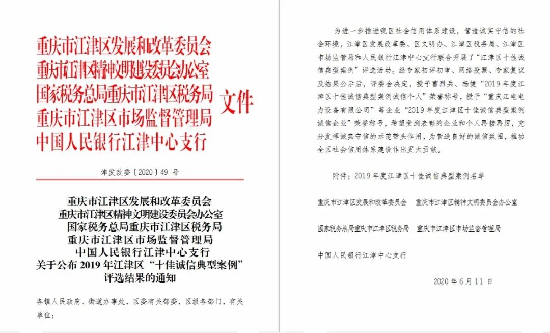 “江津區(qū)十佳誠信典型案例”活動是由江津區(qū)發(fā)展改革委、區(qū)文明辦、區(qū)稅務(wù)局、區(qū)市場監(jiān)管局和人民銀行江津支行聯(lián)合舉辦?;顒咏?jīng)過前期征集、專家初評、網(wǎng)絡(luò)投票、專家復(fù)議層層選拔,最終評選出2名“2019年度江津區(qū)十佳誠信典型案例誠信個人”稱號;8家“2019年度江津區(qū)十佳誠信典型案例誠信企業(yè)”榮譽(yù)稱號。