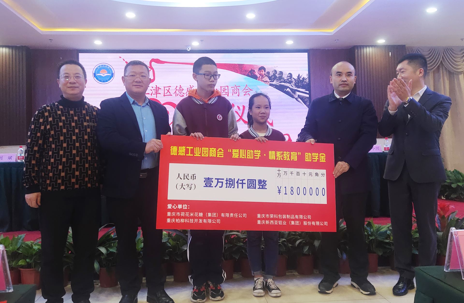 2020年10月16日,江津區(qū)德感工業(yè)園商會第三屆一次會員大會在禾宴大酒店隆重舉行,作為本次會議主要議程,會員企業(yè)—重慶市荷花米花糖(集團)有限公司、重慶市榮科包裝制品有限公司、重慶柏柳開發(fā)有限公司、重慶新西亞鋁業(yè)(集團)股份有限公司,共同出席了“愛心助學(xué)·情系教育”活動儀式。江津區(qū)委常委、區(qū)委統(tǒng)戰(zhàn)部部長楊利,江津區(qū)委常委、德感工業(yè)園發(fā)展中心黨委書記、主任李祖明,德感工業(yè)園發(fā)展中心黨委委員、副主任朱志明,江津區(qū)工商聯(lián)(總商會)主席鄒勇,江津區(qū)工商聯(lián)(總商會)副主席廖代旭、江津團區(qū)委副書記陳奕池、江津區(qū)實驗中學(xué)副校長柴瑛及德感商會92名會員共同見證了這一時刻。