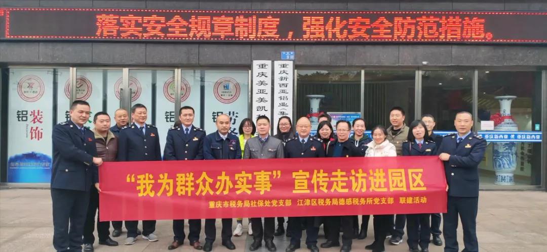為深入貫徹黨的十九屆六中全會精神,把脈問診與解決企業(yè)發(fā)展中存在的難點與問題,12月7日,由重慶市稅務(wù)局社保處、重慶市江津區(qū)稅務(wù)局及江津德感稅務(wù)所牽頭組織開展的“我為群眾辦實事”宣傳走訪團走進德感園區(qū)部分國有企業(yè)、民營企業(yè)進行政策宣講與座談交流,座談交流會在新西亞鋁業(yè)集團黨群活動室進行。